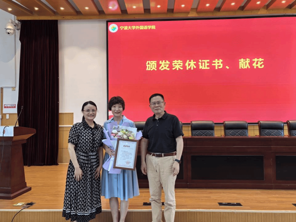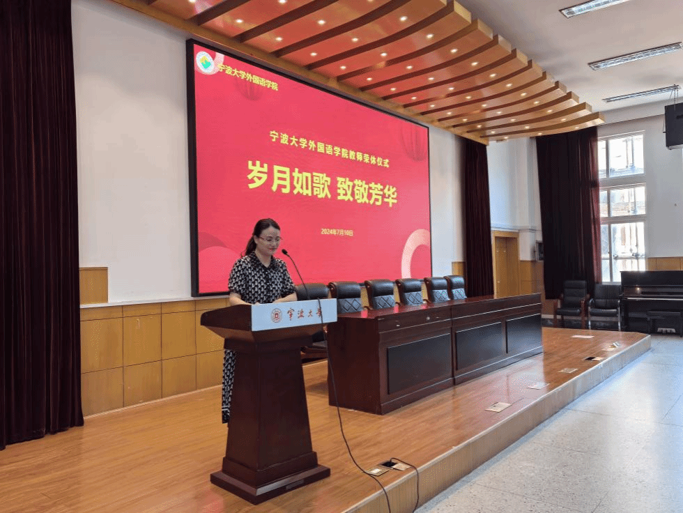 仪式上,翁华星书记宣读荣休教职工名单,分别是劳晓荔老师、林渭芳老师和蒋静老师,并介绍了三位荣休教职工所在的系部办为老师们用心描绘的在外院工作的画像,致敬和感谢三位老师数十年来兢兢业业无私奉献,为学院的蓬勃发展,为学生的成才贡献力量!
